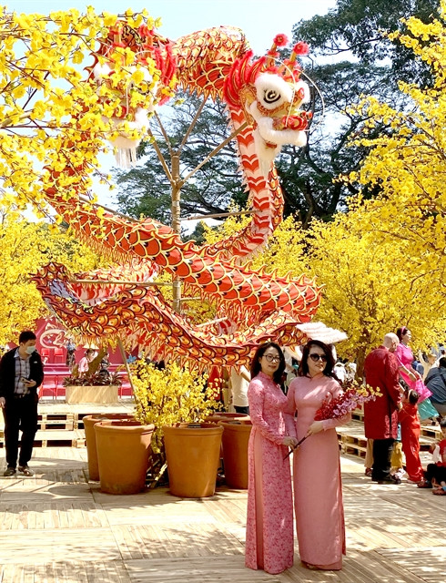 | Visitors in áo dài (Vietnamese traditional dress) take photos with a dragon model at the Vietnamese Tết Festival at the Youth Cultural House in HCM City’s District 1. VNS Photo by Phương Mai |