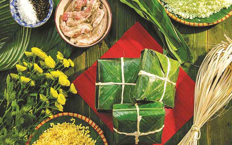 Pork roll (gio), another Tet delicacy, is made from pounded pork wrapped in banana leaves and boiled up. Another is canh mang, bamboo shoots braised with pigs' leg trotters. And the last but not least, jelly chicken is cooked from chicken with fragrant mushroom. We not only eat these Tet foods, but also offered the dishes to our ancestors, to remind us of our childhood and to pass on such traditional customs to our own children.