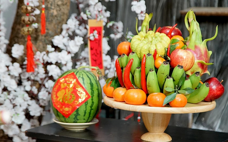 An integral part of the family ancestor altar is the mam ngu qua, the fruit tray with five different fruits. For Vietnamese, the mam ngu qua is an intrinsic aspect of Tet, as a presentation of their religious, philosophical and aesthetic beliefs. According to Oriental philosophy, the universe is composed of five basic elements: metal, wood, water, fire and earth. Each of the fruit in the Tet fruit tray symbols for one of these elements. As for fruit arrangers, the number of displayed fruits are not important, but the color of the fruits. Mother often chooses five fruits with five different colors. A hand of green bananas was arranged in the middle of the tray, topped by a yellow grapefruit; some orange citrus and purple dragon fruits were arranged around; and interspersed among the green bananas will be the red peppers.
