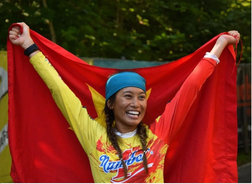 The Vietnamese woman proudly held the flag of Vietnam and burst into tears as the first Vietnamese to conquer the Deca-Triathlon World Championship and the first Vietnamese to win this challenge.