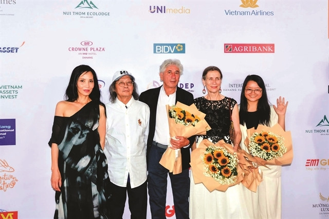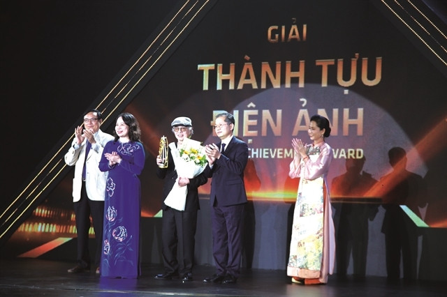 Vice President Võ Thị Ánh Xuân (2nd left) and Secretary of the municipal Party Committee Nguyễn Văn Quảng (2nd right) present the Film Achievement Award to veteran director Đặng Nhật Minh (centre). Photo courtesy of Anh Vũ/DANAFF