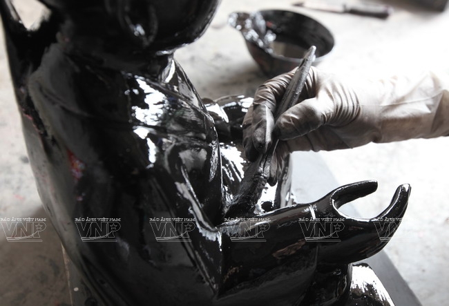 After completing a sculpture, Buong paints the statue with several layers of colours. Once finished, statues are left to dry and then polished with sandpaper to form a smooth surface and remove splinters. In the end, he covers the statues with a layer of golden paint and draws details to finalise the busts.