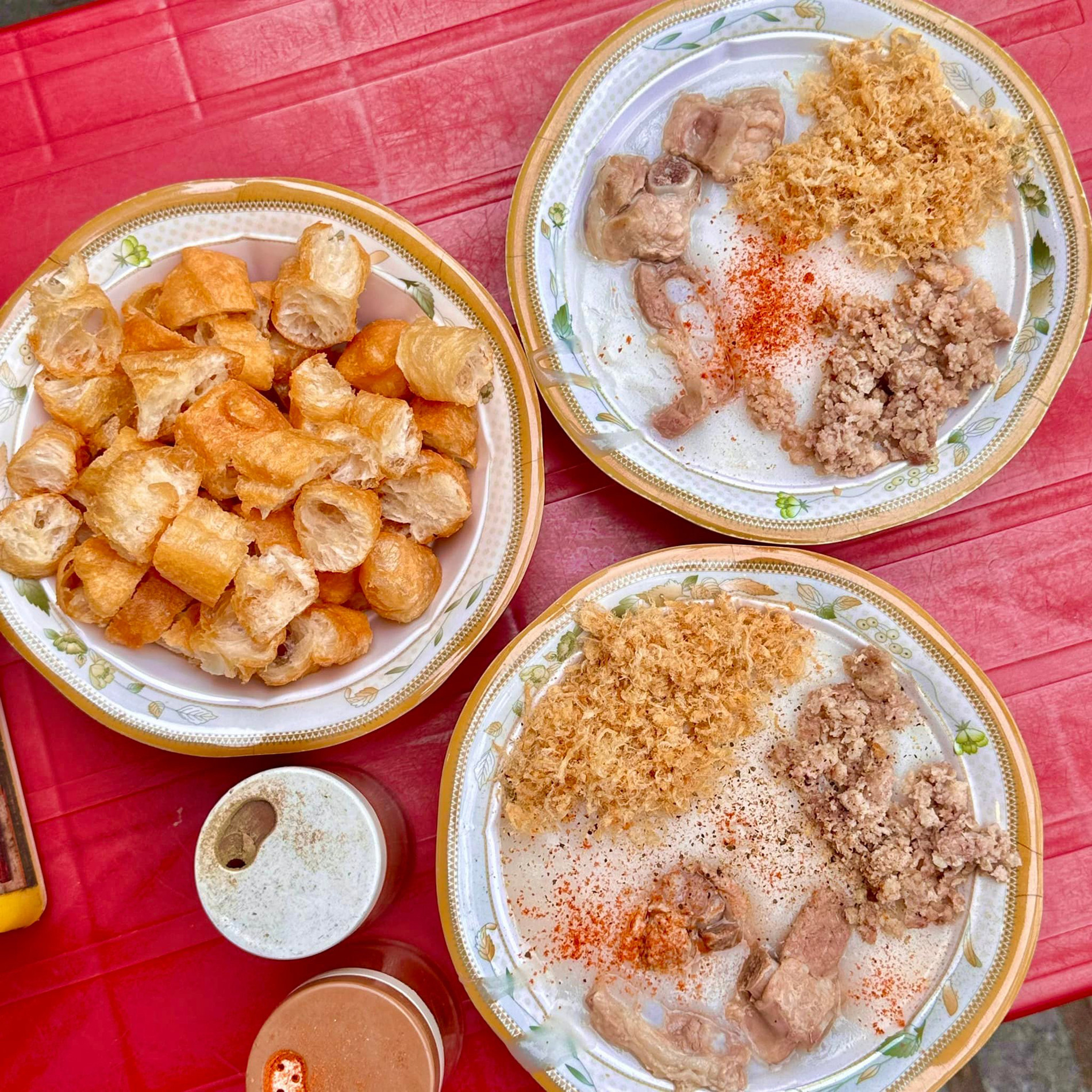 Accompaniments like crispy fried dough sticks (quay) and shredded pork floss (ruoc) add depth to the flavor.