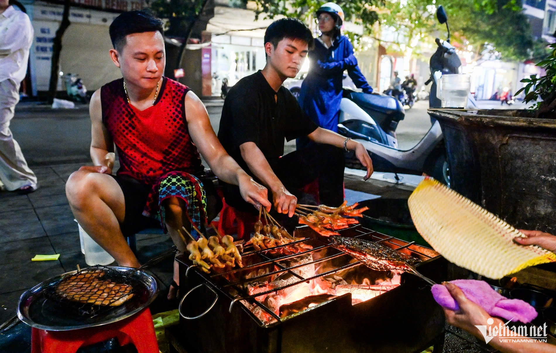 Unlike other grilling stalls, Mr. Binh avoids using electric fans to control the fire. Instead, he relies on a traditional handheld fan, constantly flipping the skewers with one hand while fanning with the other.