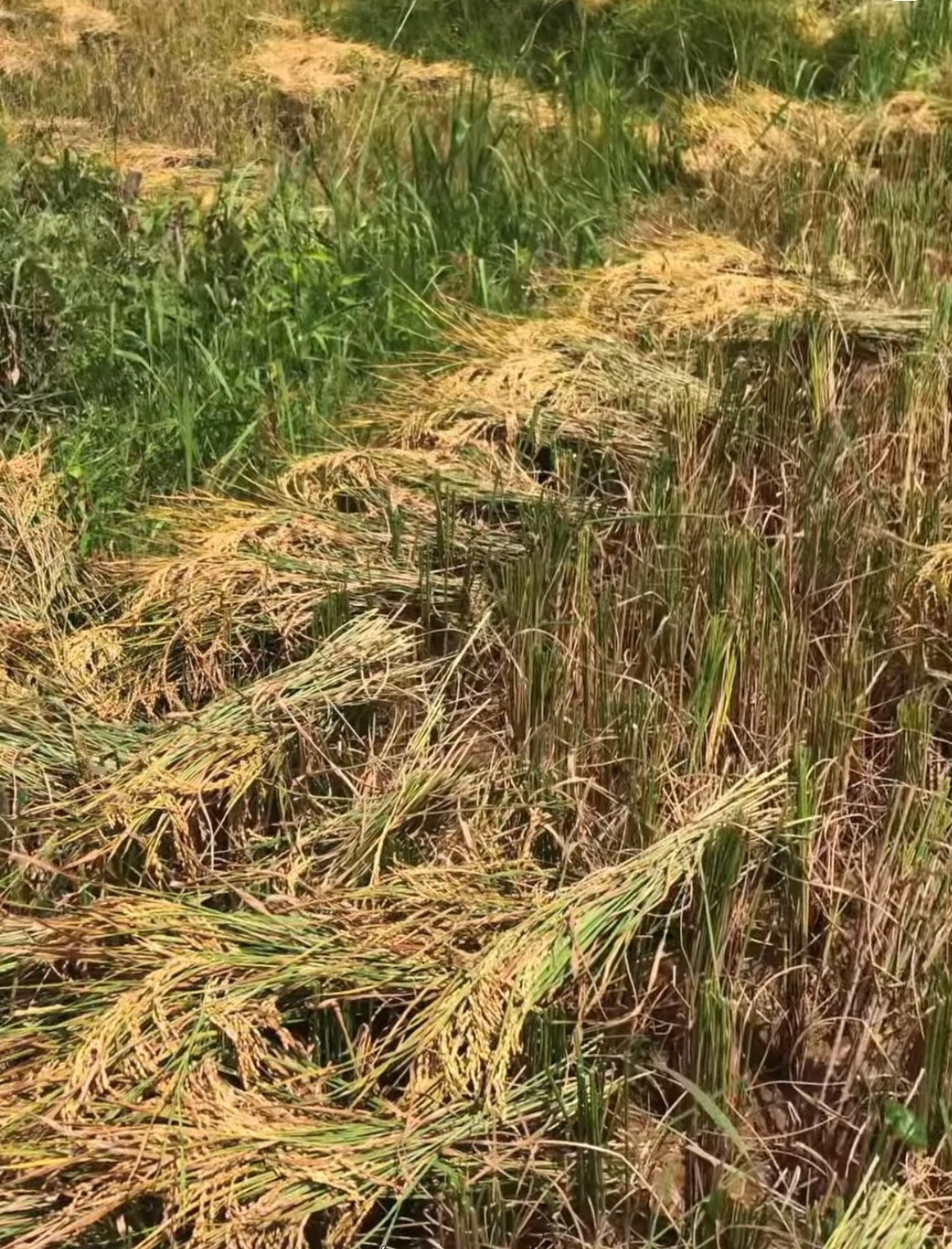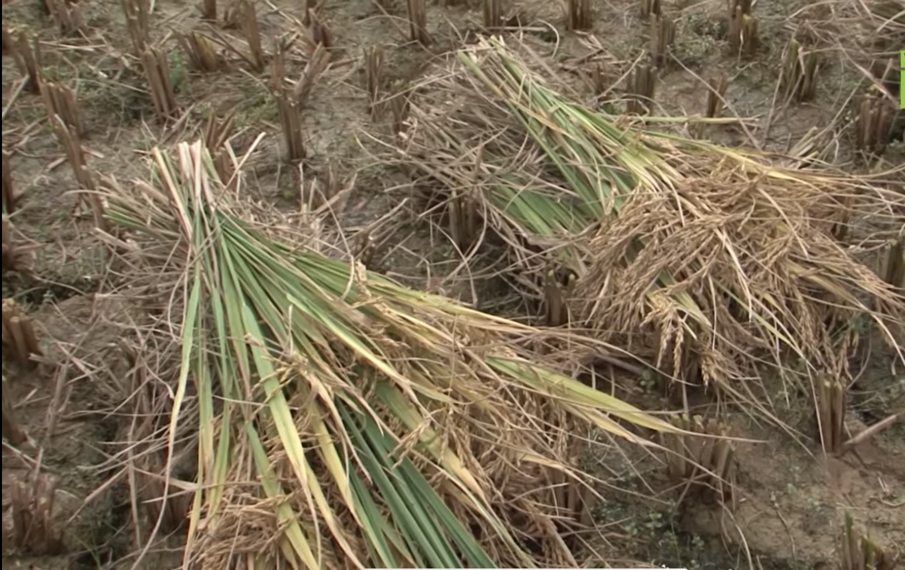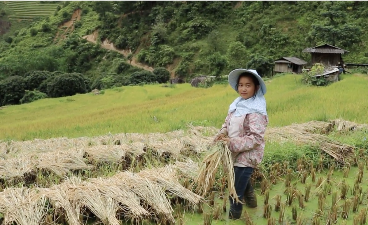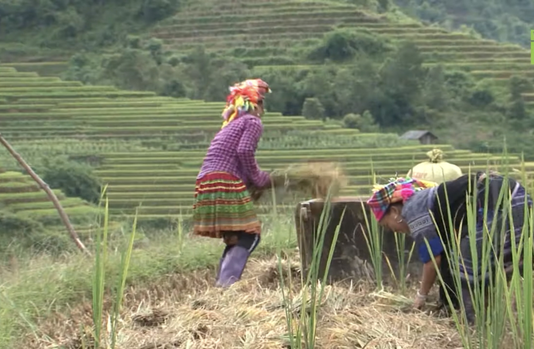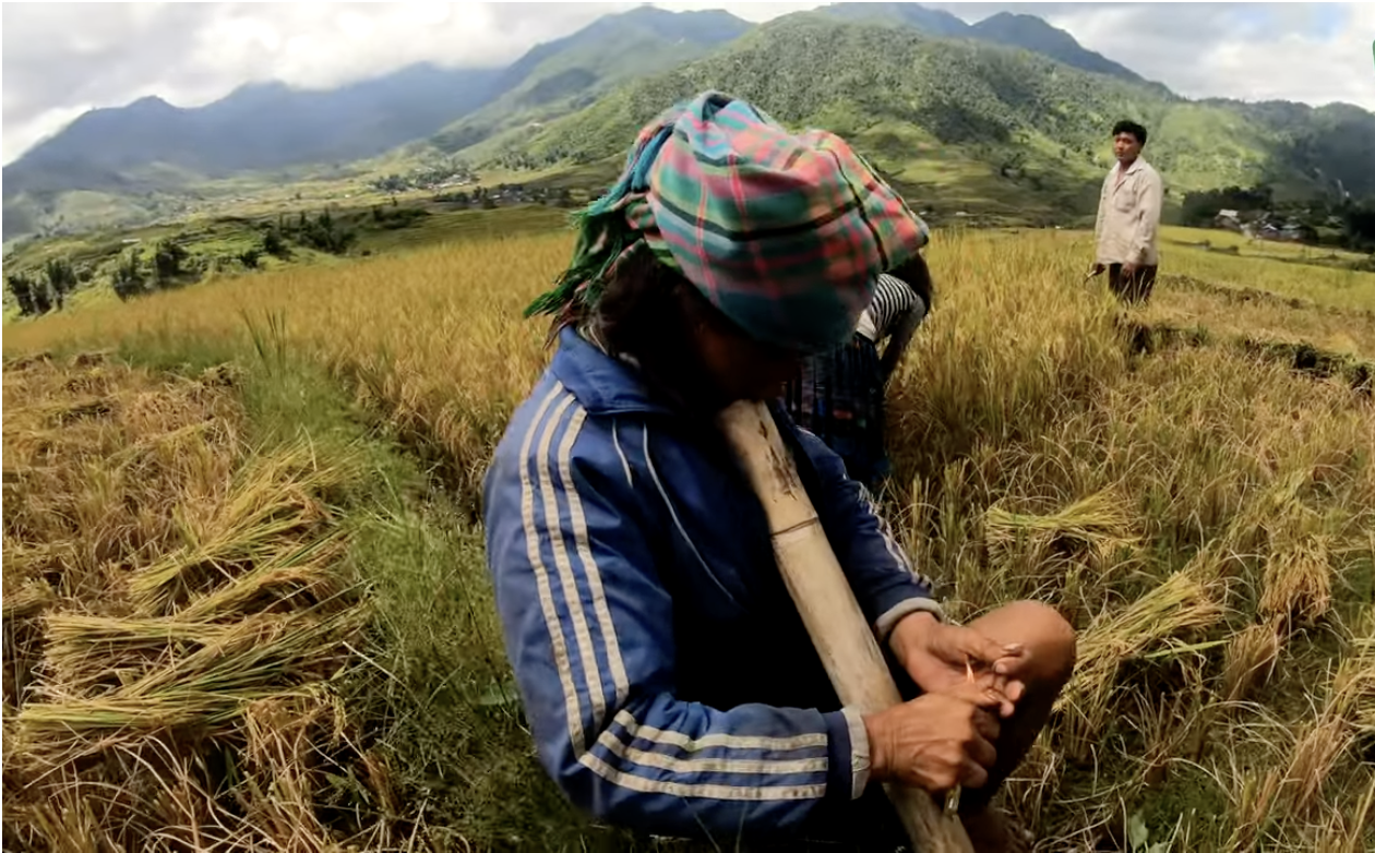 Due to the steep terrain, H'mong people harvest rice right in the fields.