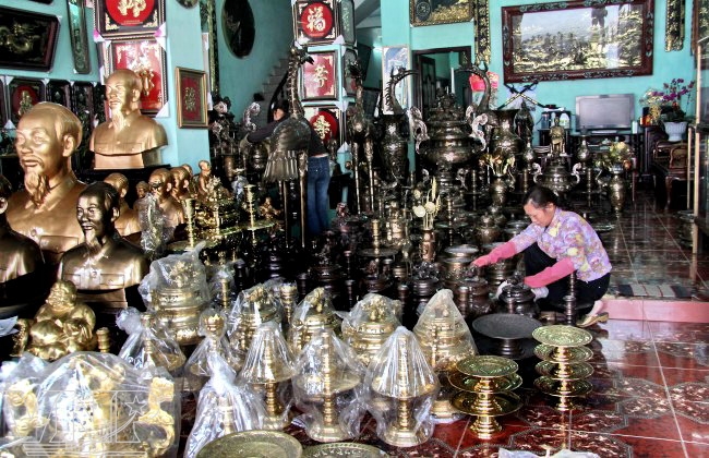 In the village, there are now about 150 workshops producing bronze fine arts items, providing jobs for over 1,500 people, each earning 3 - 4 million VND/month. Sales from the whole village reaches over 600 billion VND/year.