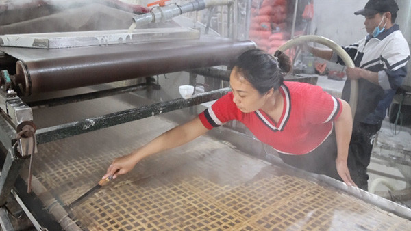 The process of making glass noodles is supported by machines but still uses human power, especially drying. Drying the noodles brings many women an income of VND400,000-500,000 per day during the Lunar New Year, and they work hard in the sun and rush to retrieve them when it rains.