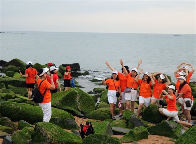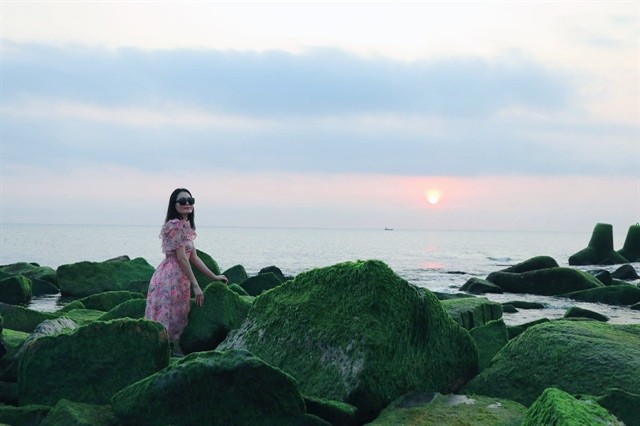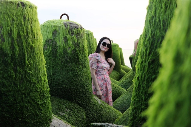 | Tourists take photos on the green moss beach. — VNA/VNS Photo Xuân Triệu |