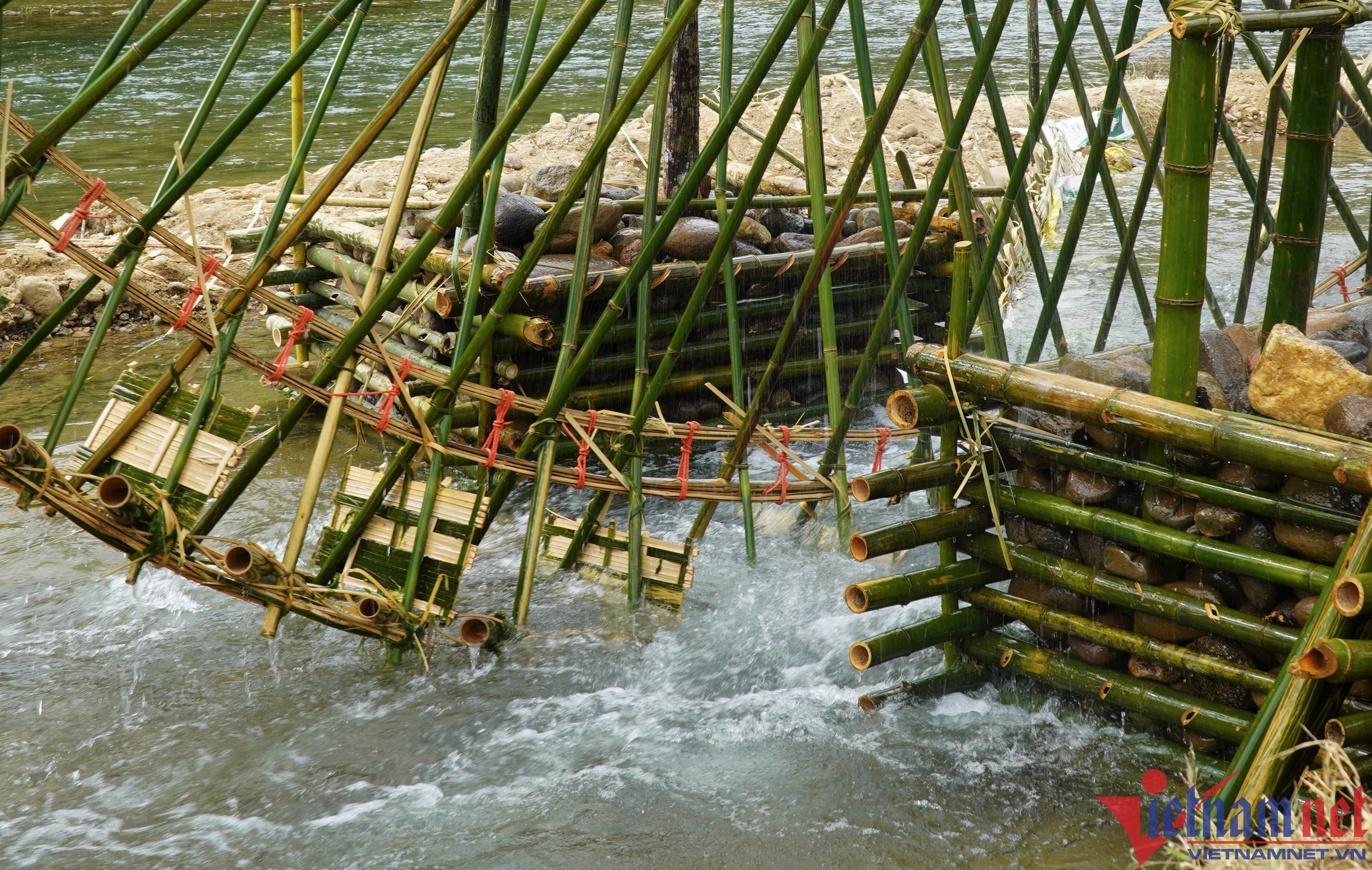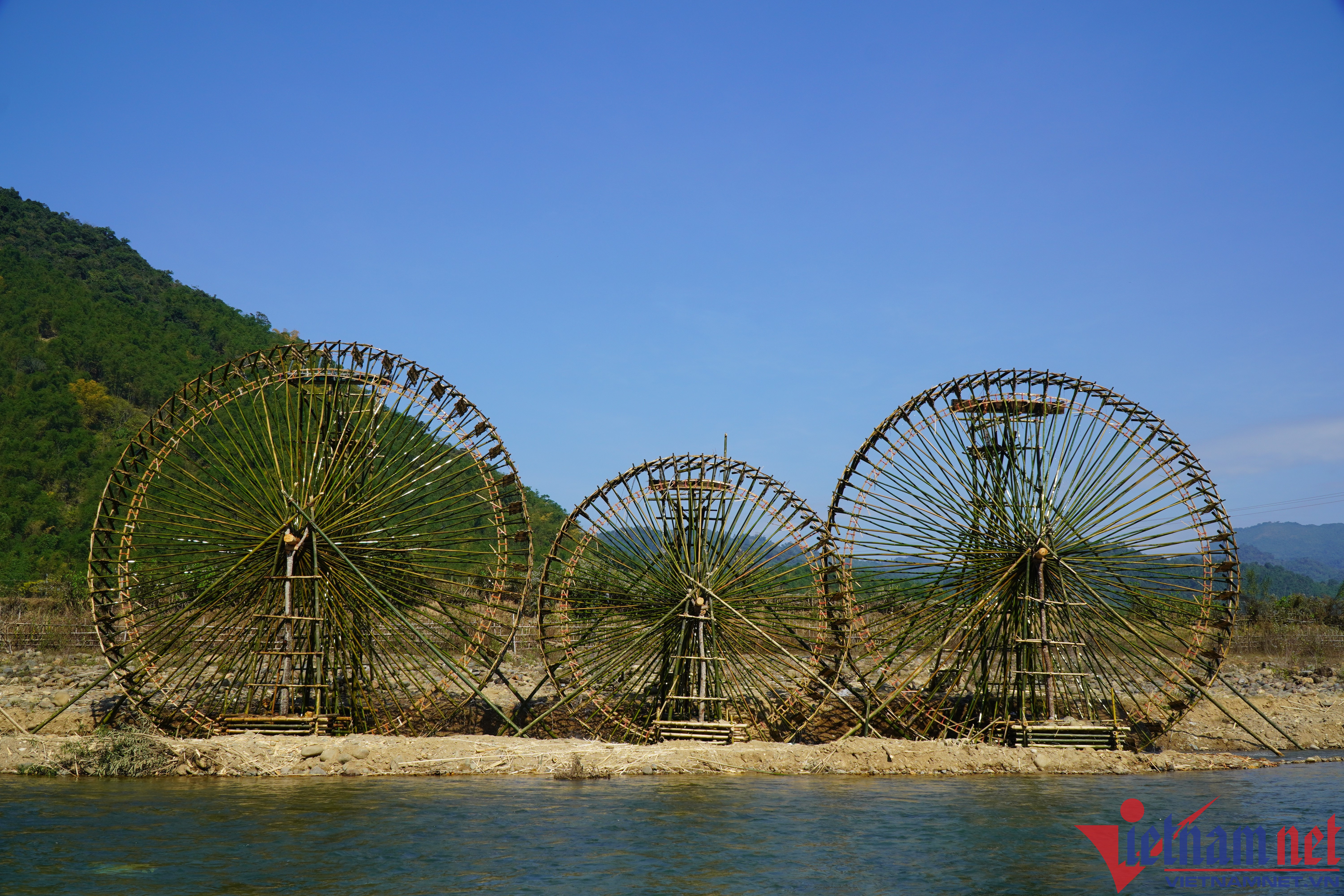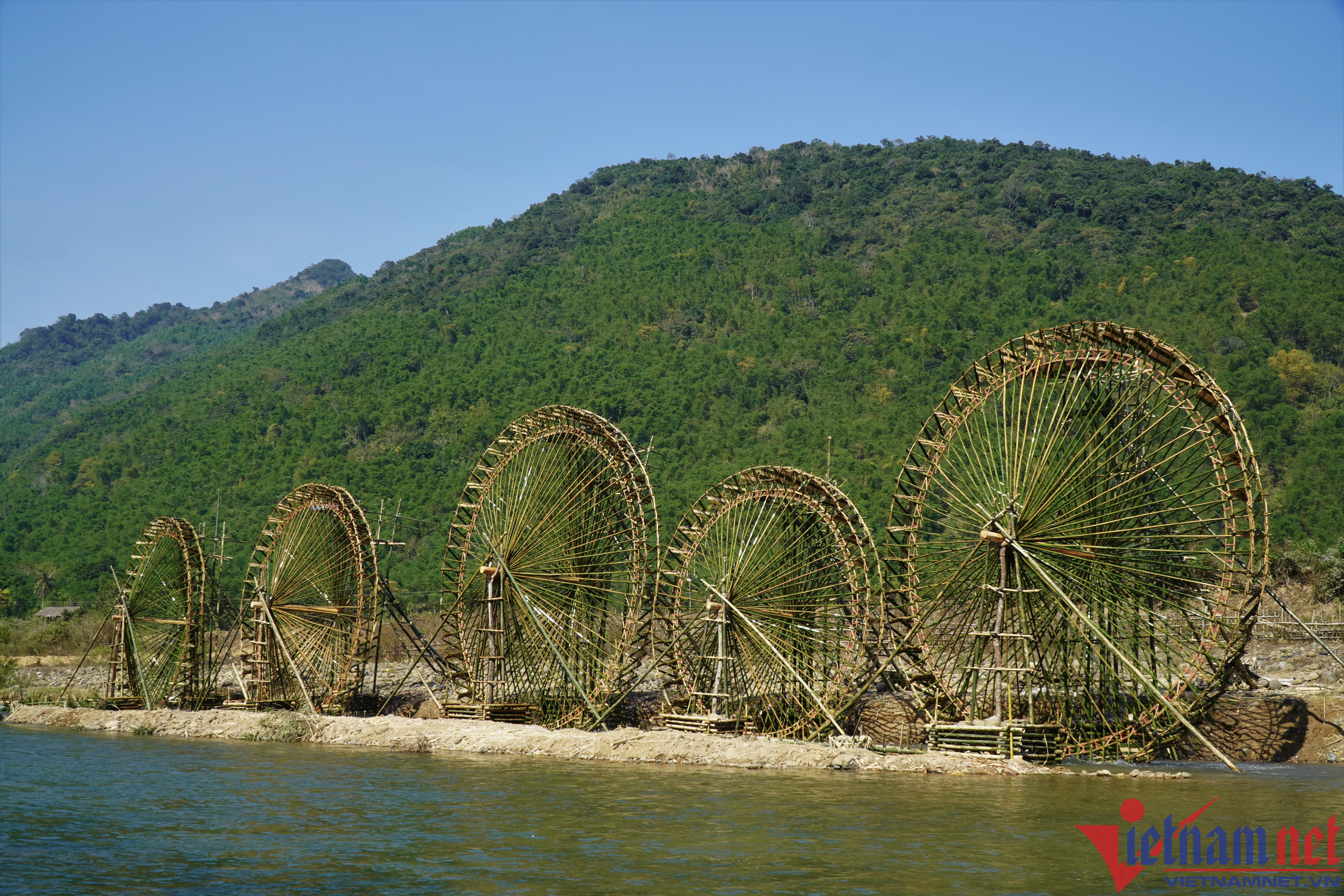 These days, ethnic people in the highland districts of Thanh Hoa such as Ba Thuoc, Quan Son, Quan Hoa are busy taking water into the fields to prepare the soil for the new crop.The waterwheels, also known as giant "machines" operated by the flow of water, rotate and take water into the trough and bring it up, leading to rice fields.Mr. Ha Van Mun, 60, a resident in Bach village, Trung Thuong commune, Quan Son district, said that local people do not know when the water wheel appeared in the region. They Just know that this waterwheel was created by their father, and has been preserved for generations until today.The waterwheel is made entirely by hand, by available natural materials such as bamboo.The axis is the deciding factor for the success or failure of the waterwheel.When the reels spin, the water canister will be pressed deep into the stream to draw water.The reel raises the water pipe up, the water pipe automatically pours water into the trough to bring water into the field.The trough is used to bring water into the field.After water runs into the fields, farmers prepare the soil for the sowing.