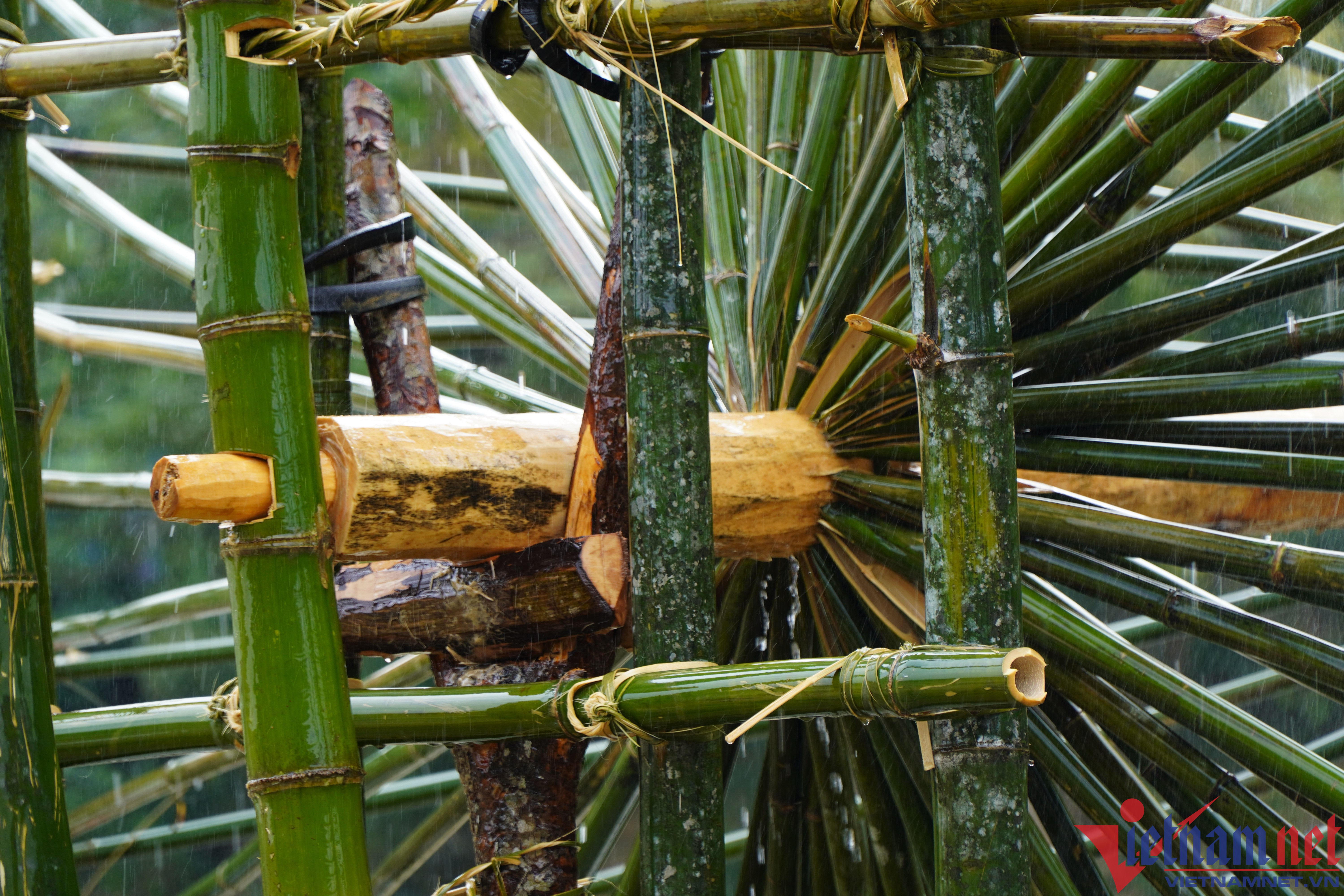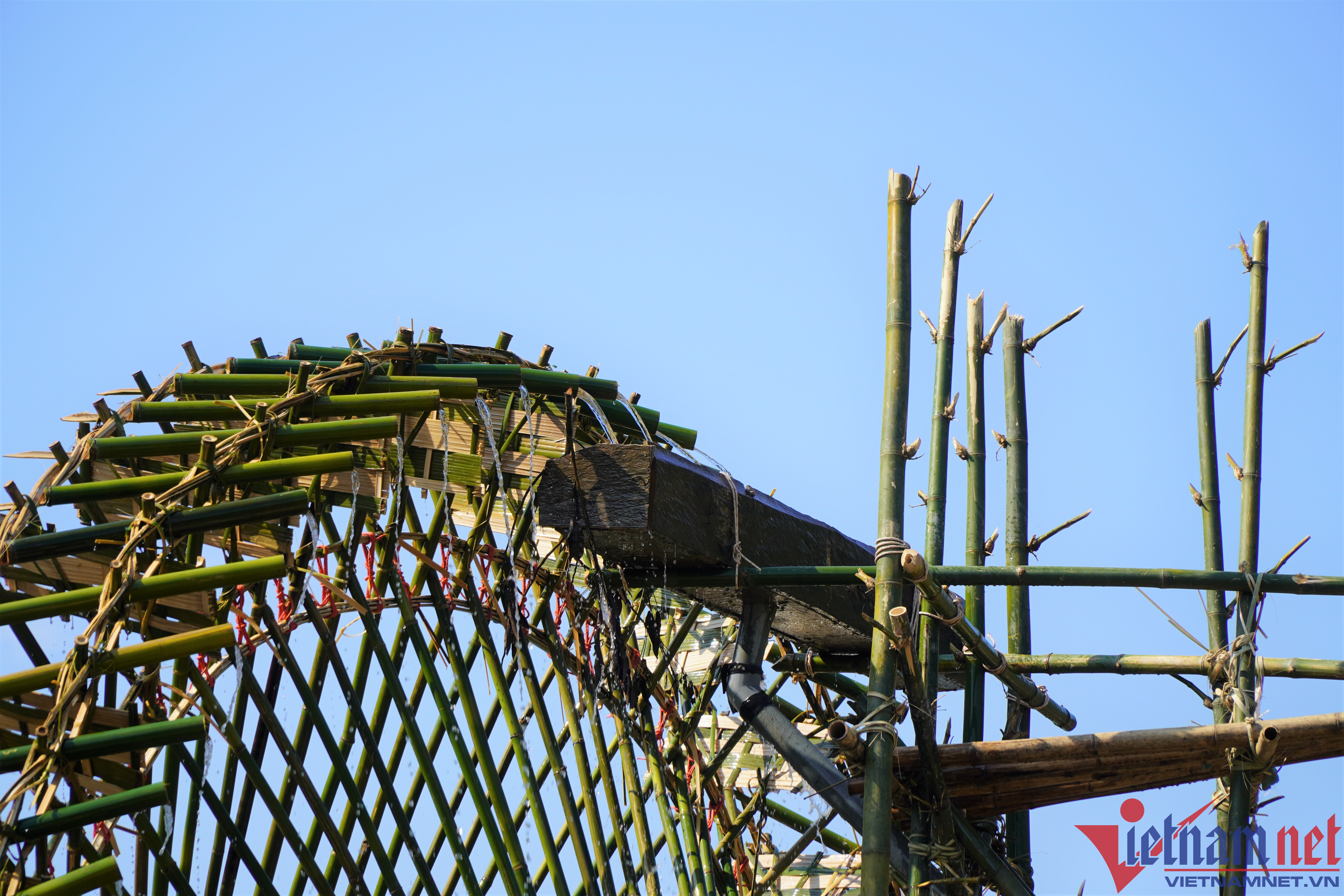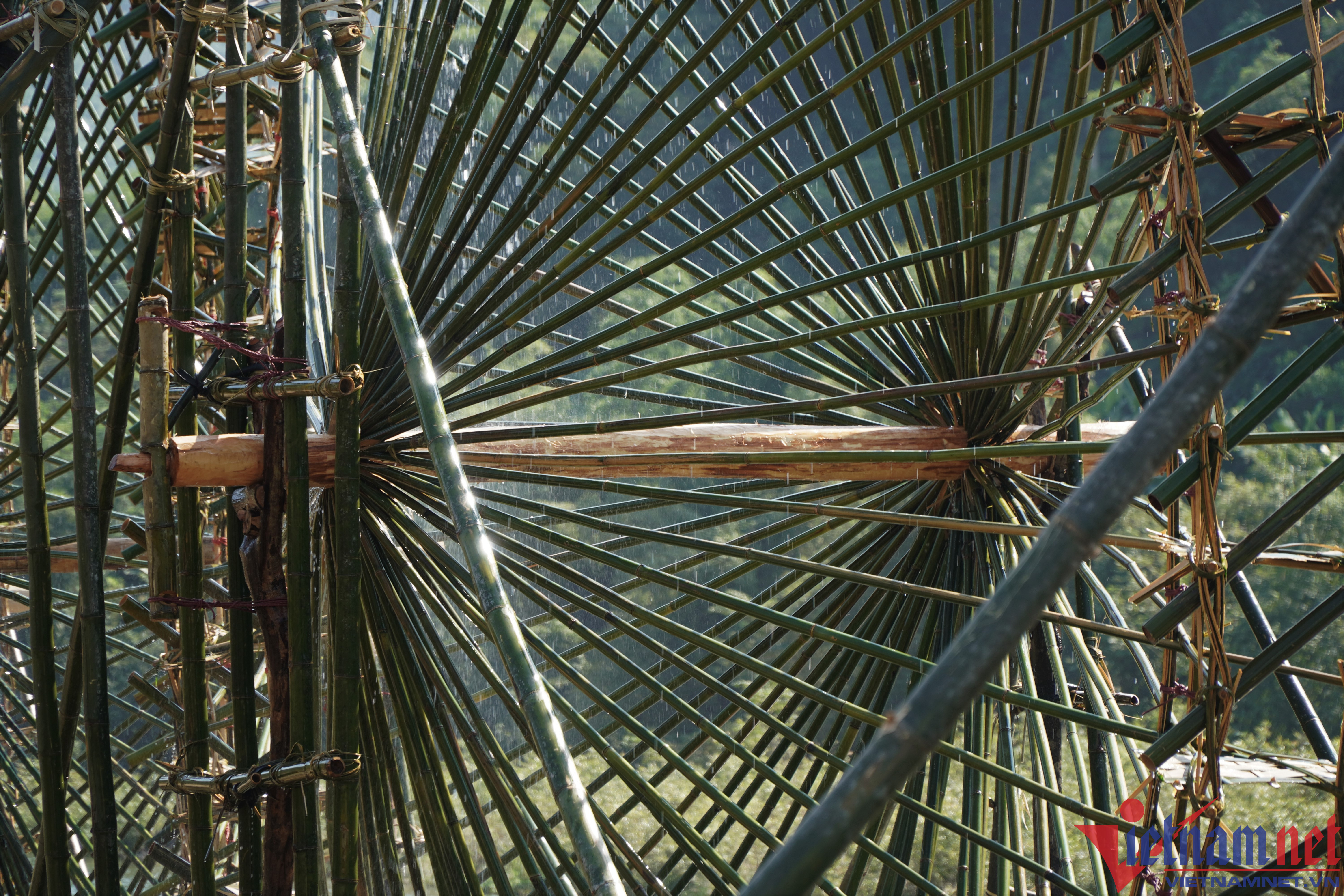 These days, ethnic people in the highland districts of Thanh Hoa such as Ba Thuoc, Quan Son, Quan Hoa are busy taking water into the fields to prepare the soil for the new crop.The waterwheels, also known as giant "machines" operated by the flow of water, rotate and take water into the trough and bring it up, leading to rice fields.Mr. Ha Van Mun, 60, a resident in Bach village, Trung Thuong commune, Quan Son district, said that local people do not know when the water wheel appeared in the region. They Just know that this waterwheel was created by their father, and has been preserved for generations until today.The waterwheel is made entirely by hand, by available natural materials such as bamboo.The axis is the deciding factor for the success or failure of the waterwheel.When the reels spin, the water canister will be pressed deep into the stream to draw water.The reel raises the water pipe up, the water pipe automatically pours water into the trough to bring water into the field.The trough is used to bring water into the field.After water runs into the fields, farmers prepare the soil for the sowing.