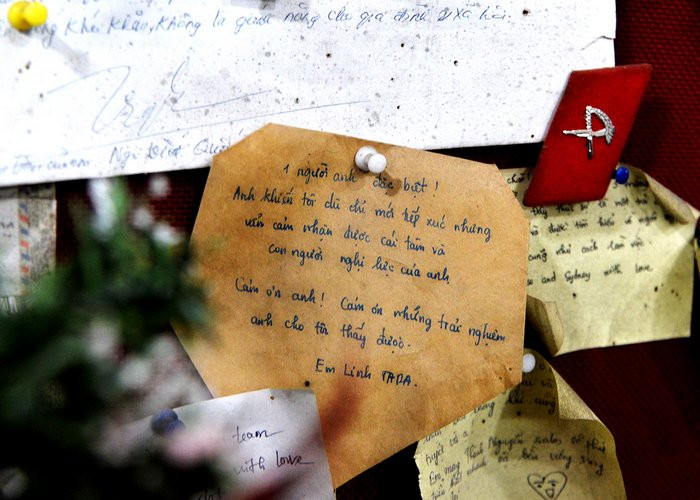 There are many small pieces of paper with wishes for success and sincere thanks from guests to Thanh in his hair salon.