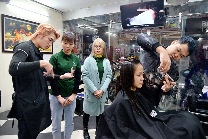 The trainees are guided and instructed directly by Thanh while he is cutting the customers’ hair.