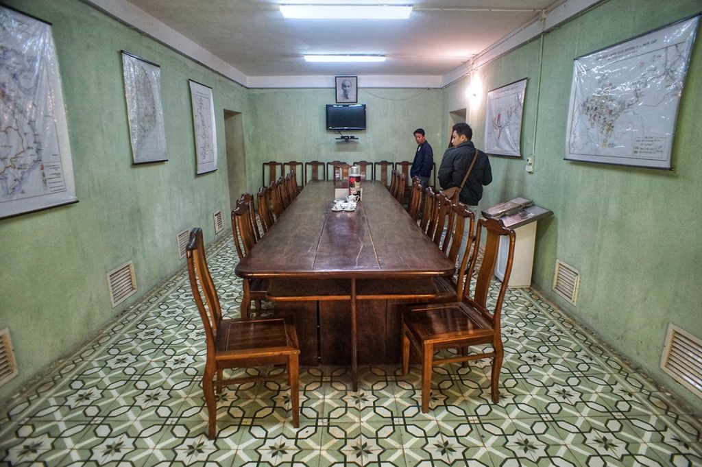 At the centre was the meeting room of the Politburo and the Central Military Commission (about 76 square meters). Adjacent to it was a lounge about 37 square meters in area. The small room to the east, which covered 35 square metres, was the work place of General Vo Nguyen Giap while the small room of the same size to the west was the work place of General Van Tien Dung. From Building D67 there were two stairs connecting directly to Bunker D67 (also known as the Central Military Commission Bunker).