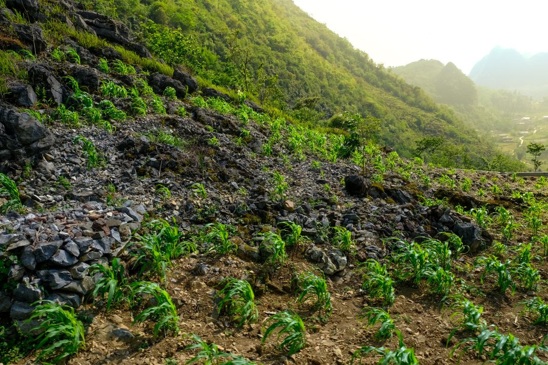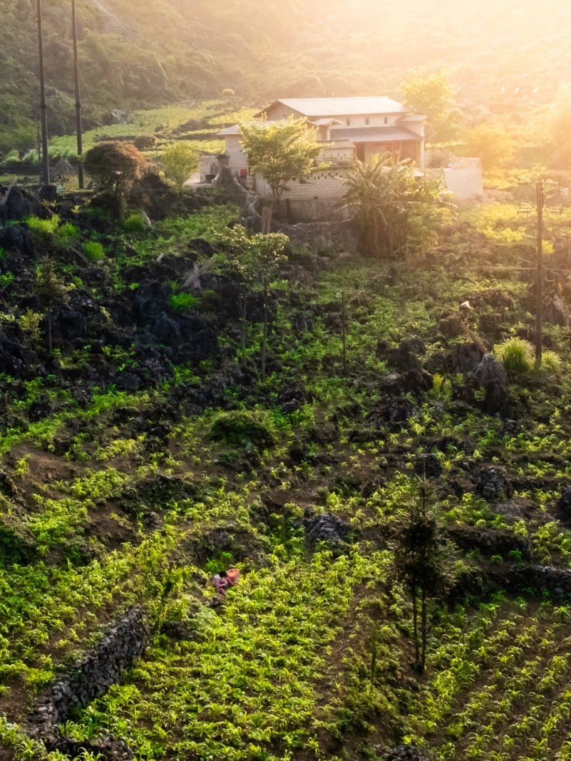 The landscape is dotted with houses built on the rugged terrain, surrounded by majestic forests and mountains. The stark gray of the rocky plateau contrasts beautifully with the bright green hues of the corn and paddy fields, symbolizing the resilience of the local people.