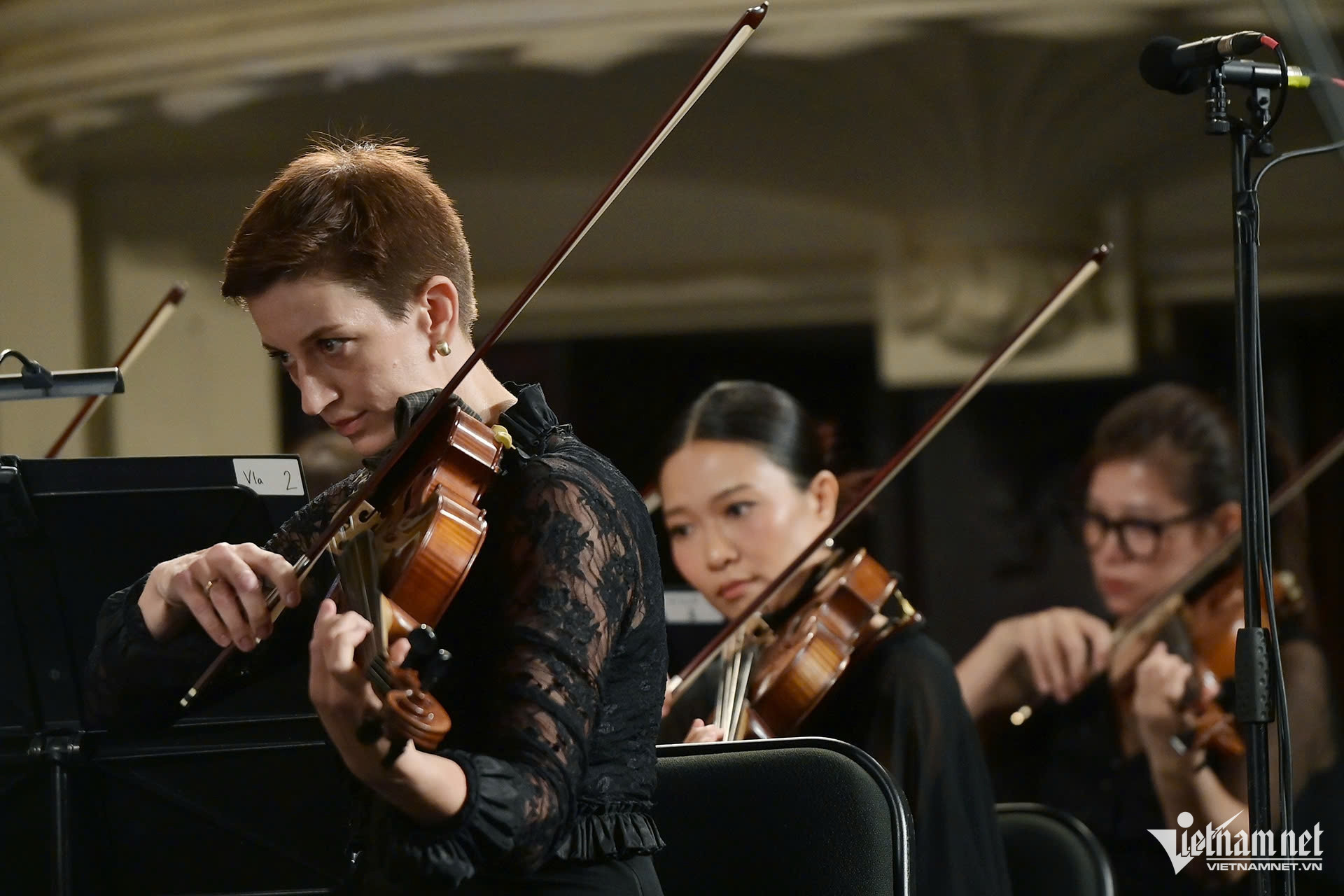 The piece "Hanh Quan Xa" (composed by Do Nhuan), arranged by musician Tran Manh Hung, was performed by the Ao Linh Group alongside the Sun Symphony Orchestra and conductor Olivier Ochanine.