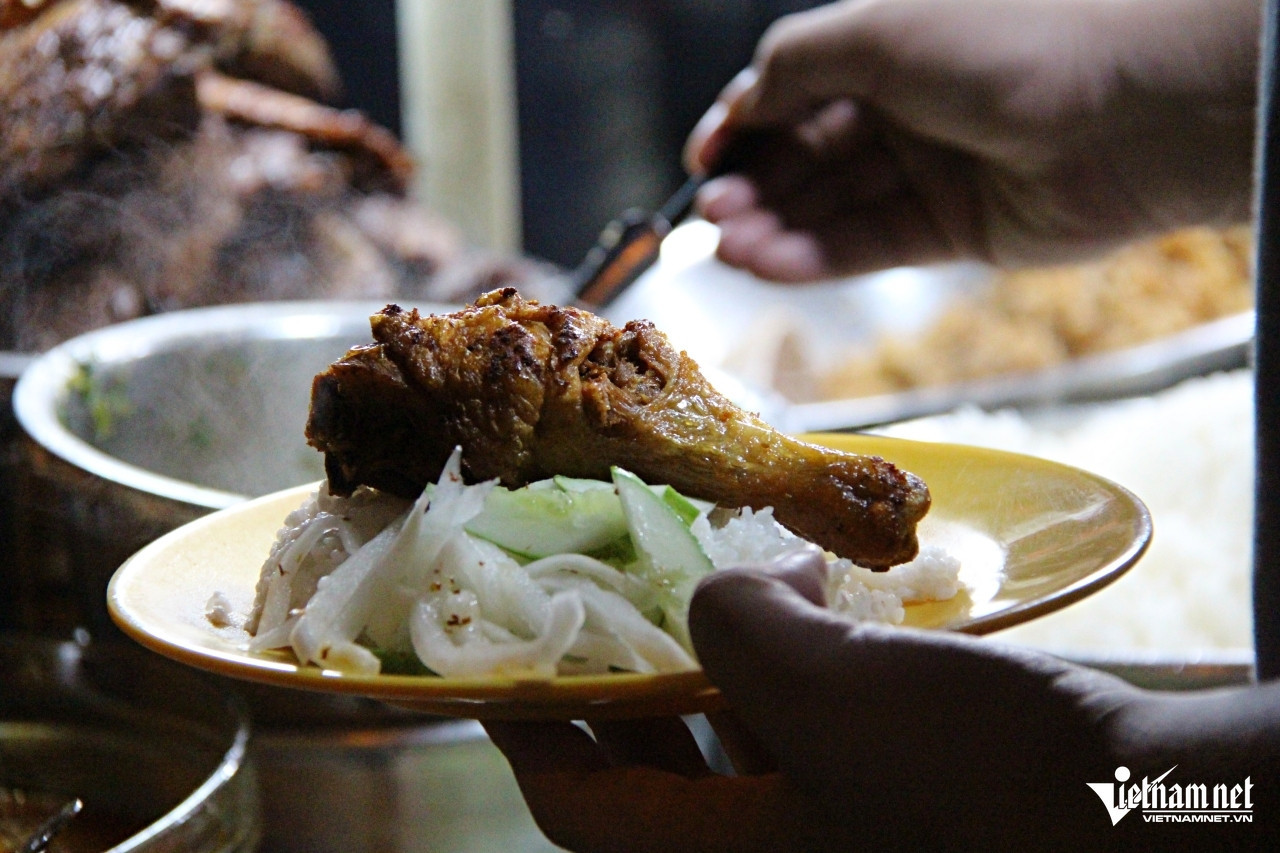 Thanh typically handles stir-fried dishes, while Phong prepares braised, fried, and grilled items. He only grills ribs at the stall each evening to ensure the meat is hot and freshly made.