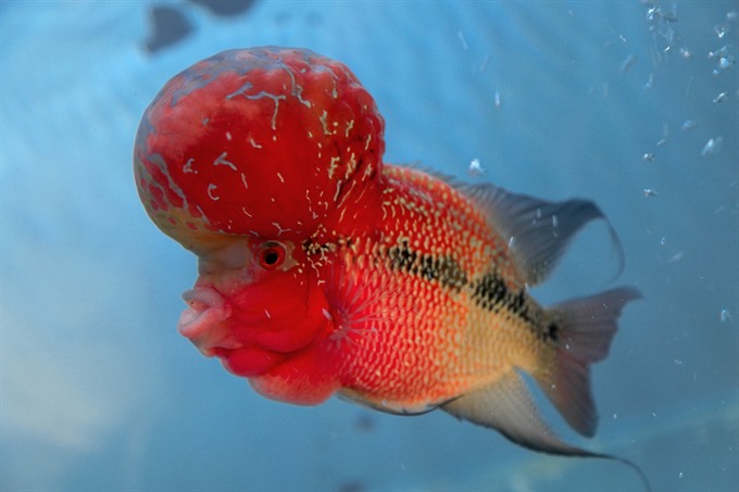 The flower horn, one of the most popular ornamental fish, is noted for its vivid colours and distinctively shaped head.