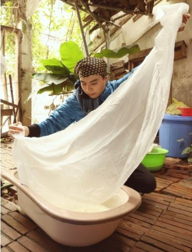 Huy cleans a piece of white fabric before dyeing it naturally.