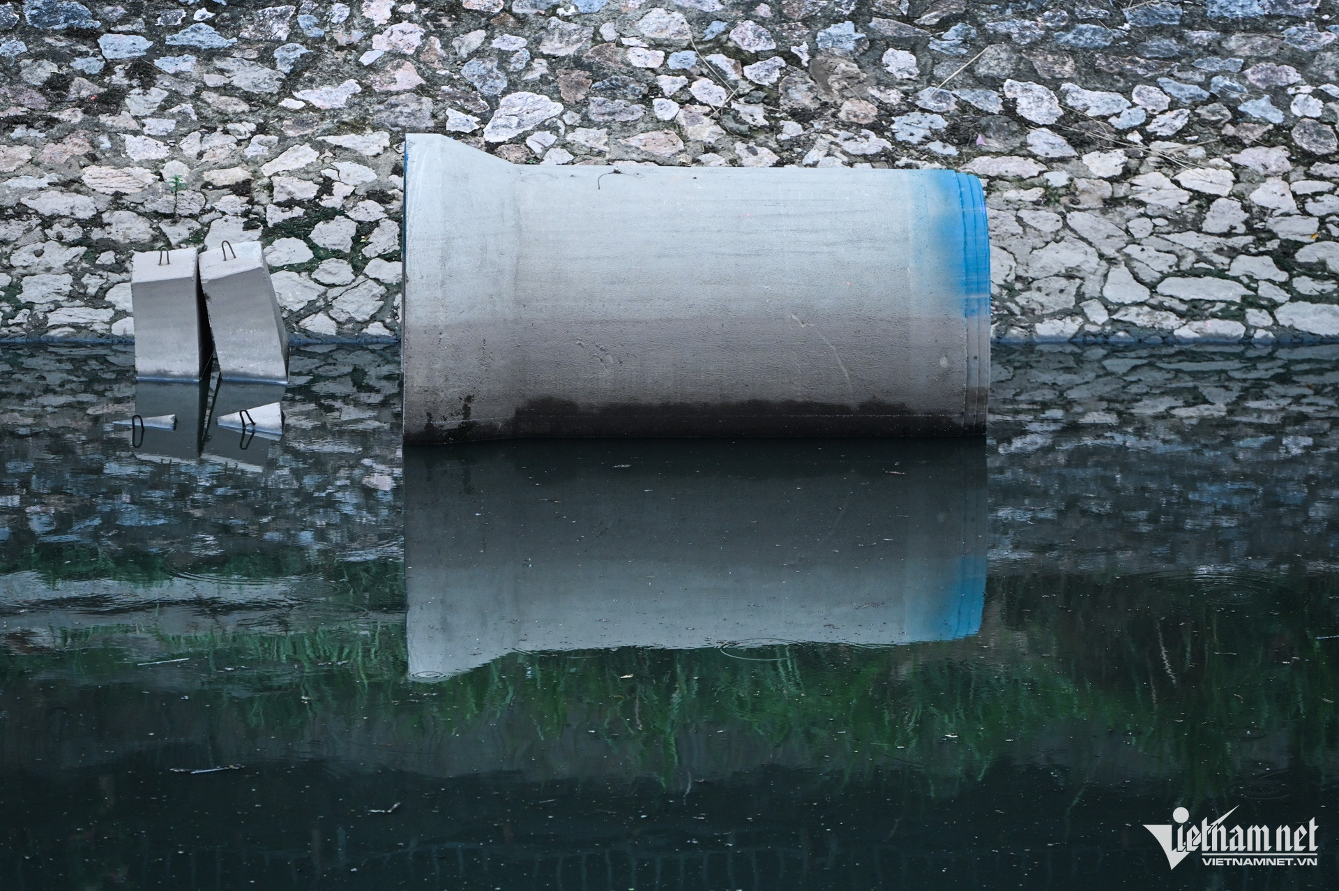 At an intersection, wastewater drains flow into the To Lich River. People on the sidewalks around this area still feel an unpleasant smell.