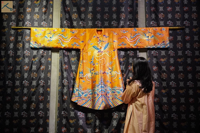 | DOWN TO A T: A visitor views a Vietnamese traditional costume at the Nếp Màu Tự Nhiên (Natural Colour Impressions) exhibition. Photo courtesy of Ba Ngàn Art |
