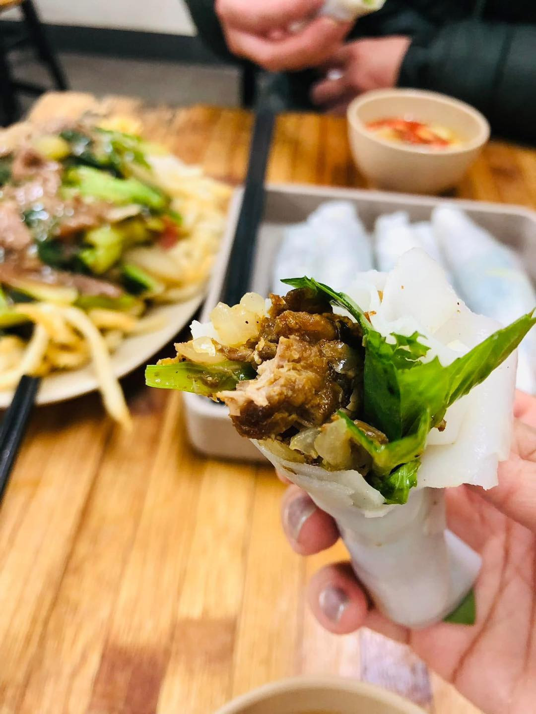 The rolls are served in portions of 10, each plump and tightly wrapped. The noodle skin is thin, while the filling includes well-seasoned beef and plenty of fresh herbs.