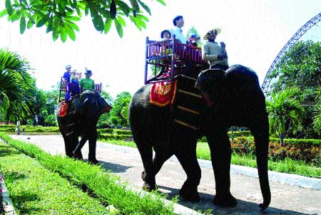 | Riding high:Tourists enjoy the view from the back of elephants. — VNA/VNS Photo Sy Huynh |