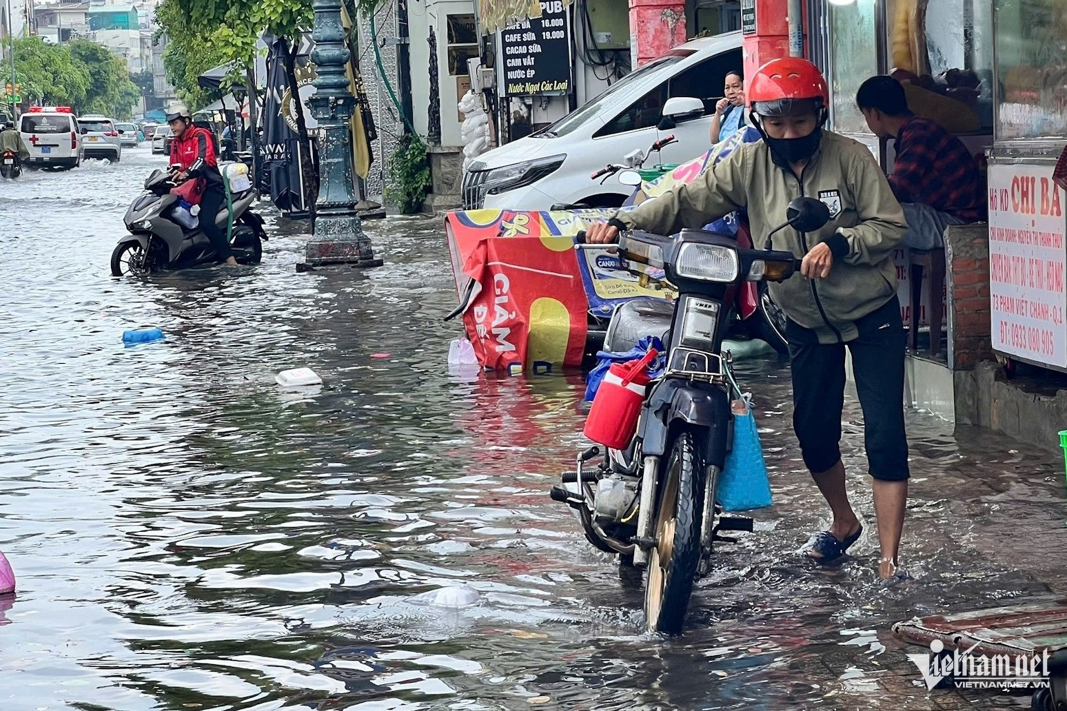 Pham Viet Chanh Street, from the Cong Hoa six-way intersection to Cong Quynh Street in Nguyen Cu Trinh Ward, saw water depths up to half a meter, causing major traffic disruption. Numerous vehicles stalled, and roadside shops were engulfed by the rising water.