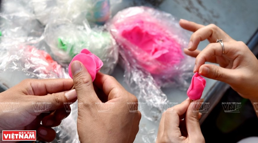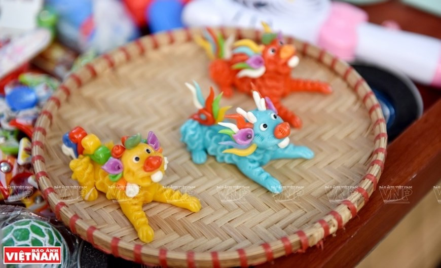 To He (toy figurine) is a traditional toy for children. It is made of sticky rice powder, sugar and food colouring. (Photo: VNA) Toy figurines are sold on the Ho Guom pedestrian street during weekend. (Photo: VNA) Toy figurines’ four basic colours are yellow, red, blue and black. (Photo: VNA) Xuan La artisans use simple tools such as a comb, bamboo sticks and beeswax to create a toy figurine. (Photo: VNA) In the past, To He were usually familiar animals, fruits and national heroes. Now the figurines are created in a greater variety of imaginative forms. (Photo: VNA) The craft requires dexterity, creativity and precision in every detail to turn out quality products. (Photo: VNA)
