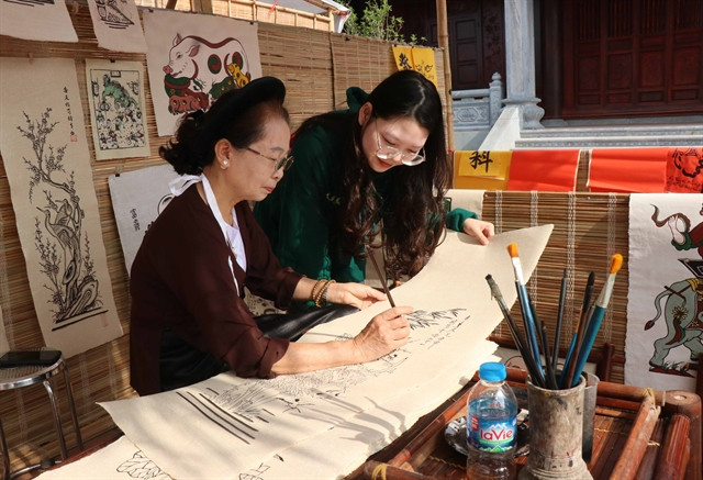 The re-enacted Đông Hồ Painting Market includes 20 booths that not only showcase folk paintings for sale, but also enable visitors to learn about the process of woodblock printing.