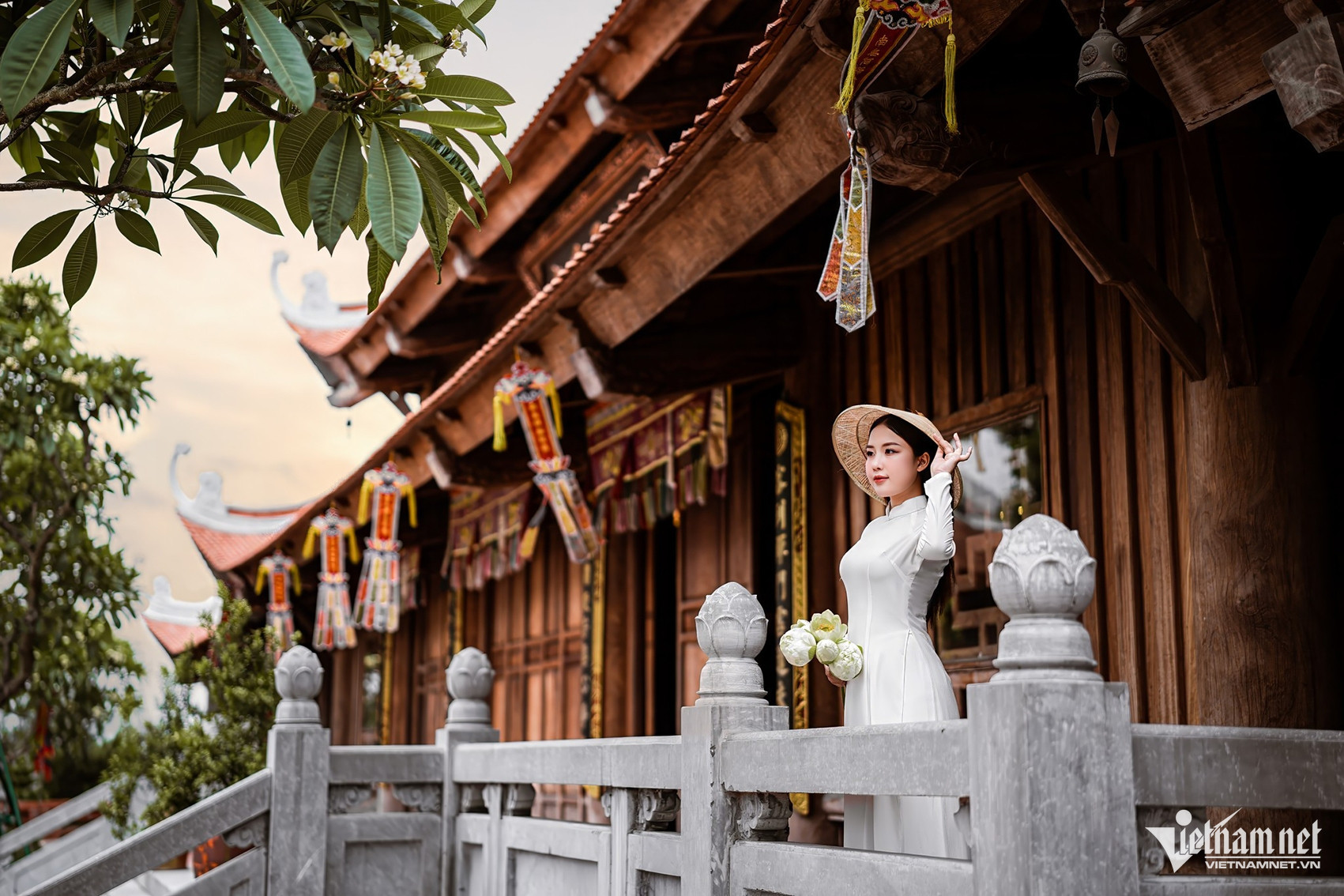 A highlight of the design is the intricate wooden frame structure, known as “gia chieng - chong ruong,” combined with delicately stylized lotus and cloud motifs.