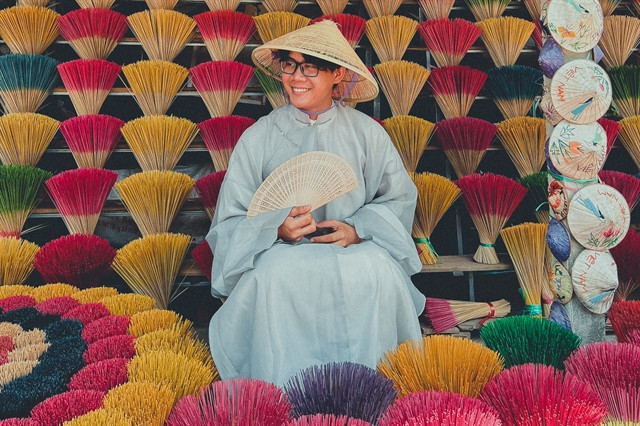 | Nguyễn Tuấn Khanh wears an 'áo dài' in Thủy Xuân incense village in Huế City. Huế was one of his favourite destinations in his Việt Nam tour with the traditional long dress. Photos courtesy of Nguyễn Tuấn Khanh |