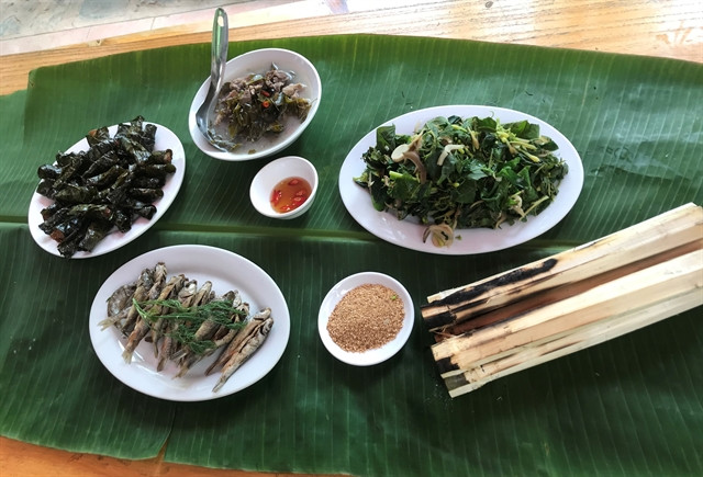 Mường people display their dishes on banana leaves. — Photo Lê Hương