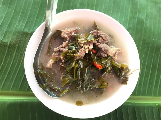 The buffalo meat is quite gamey, but the sour leaves erase any unpleasant odour. The sour leaves also help the buffalo cook quicker. The soup is tasty, with slightly fatty yet soft buffalo meat.