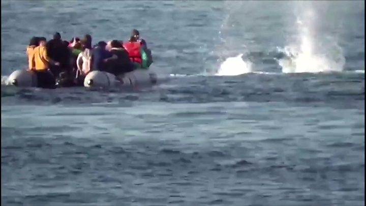 Greek coast guards shot into the sea beside this migrant dinghy and pushed it around with their boats