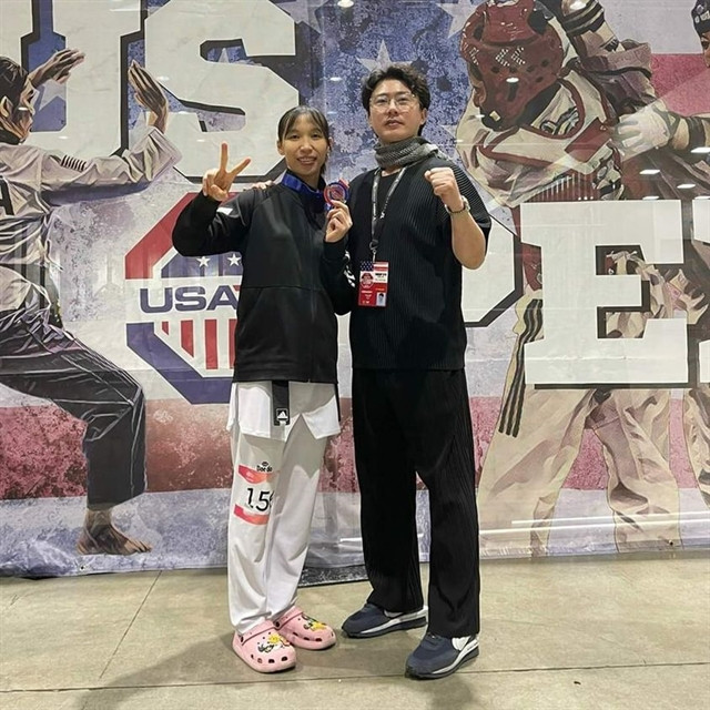 | Taekwondo fighter Trương Thị Kim Tuyền (left) and her coach pose for photo after winning silver at the US Open taekwondo tournament on February 19 in Nevada. Photo courtesy of Trương Thị Kim Tuyền |