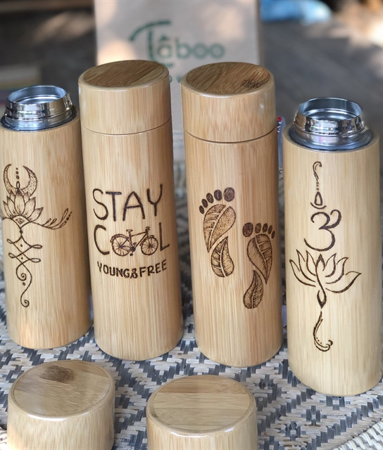 | Water bottles are covered by bamboo. Bamboo has been selected as an environment-friendly material for sustainable development. Photo courtesy of Taboo Bamboo |