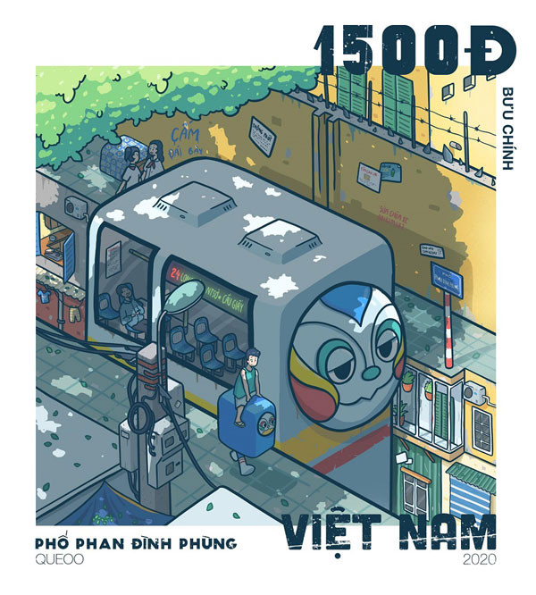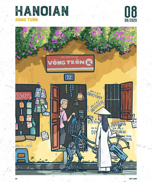 The time the fourth-year student drew this painting coincided with Hanoi’s social distancing period due to Covid-19 in 2021, so there was practically no street life for him to observe. The young man growing up in the capital could only rely on his memories and Google to draw the first strokes.