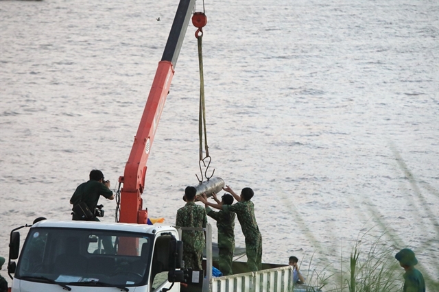 Hanoi military personnel retrievethe unexploded bomb from the Hồng (Red) River on Monday afternoon.