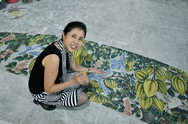 Compared to the original design drawings with the entire trunk and pillars supporting the top of the tree in the same blue color, artist Thu Thuy changed the design by decorating each pillar supporting the trunk with mosaic star fruit, peach and apricot flowers.