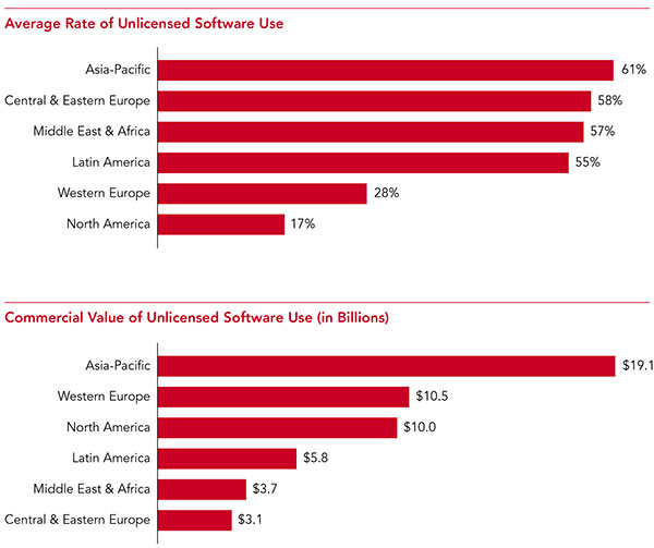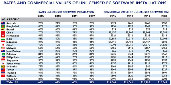 In the Asia-Pacific region, 61 per cent of software installed on computers in 2015 was unlicensed, while the commercial value of unlicensed software use was valued at $19.1 billion.
