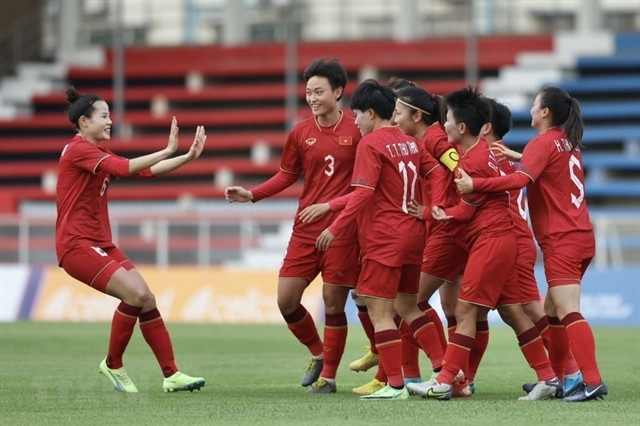 | Việt Nam celebrate beating Malaysia in the women’s football at the SEA Games in Cambodia on Wednesday. |
