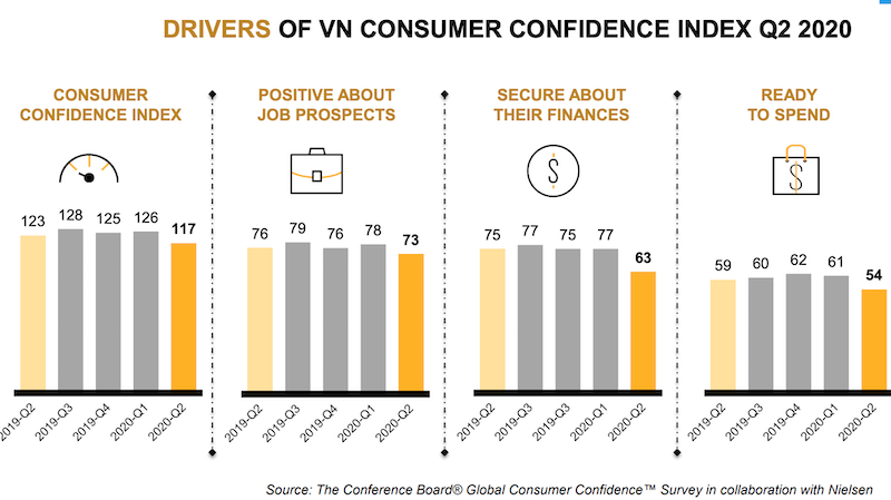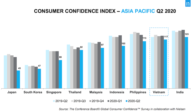 Overcoming the first wave of Covid-19, in the second quarter (Q2) of 2020, Vietnam became the second most optimistic country globally with Consumer Confidence Index of 117 points, despite being down 9 points compared to Q1, according the latest report by Nielsen Vietnam for Q2/2020.