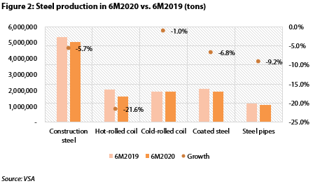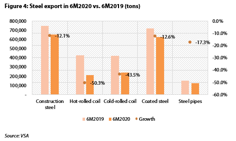 Meanwhile, the steel industry was hit strongly during the pandemic. In the January – June period, the steel industry (including construction steel, coated steel, and steel pipes) produced 8.1 million tons of steel and sold 7.8 million tons, of which 1.4 million tons were exported, decreasing by 6.4%, 7%, and 12.8% year-on-year, respectively. Noticeably, although depending on export, coated steel consumption decreased by just 1.2% year-on-year.