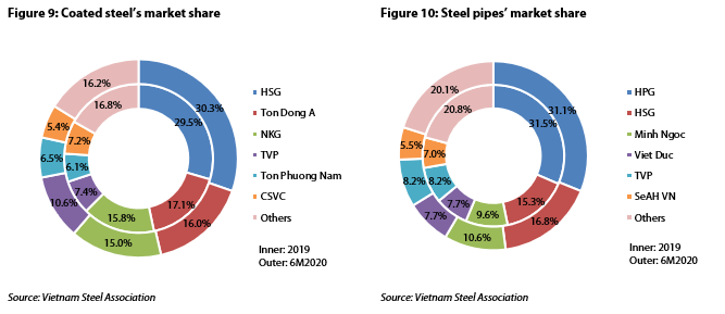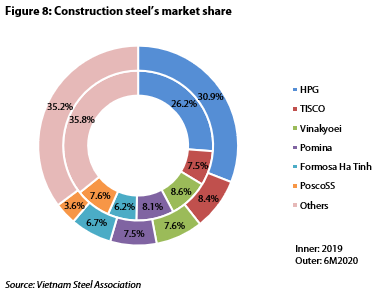 In the construction steel segment, Hoa Phat Group (HPG) continued to expand its market share from 26.2% in 2019 to 30.9% in the first half of this year. Its selling volume increased by 12.4% year-on-year, although the segment’s selling volume decreased by 8.7%. In the Southern market, HPG’s market share expanded steadily as it sold roughly 65,000 tons in June, equivalent to a market share of 24.3%, higher than that of 22.6% in the previous month.
