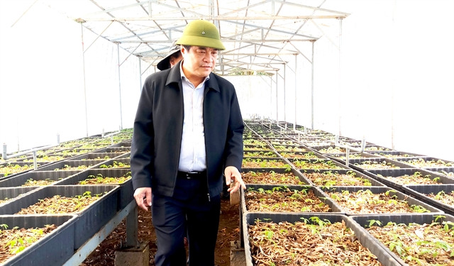 Provincial secretary Phan Viet Cuong examines the quality of panax ginseng grown at the Tra Linh Medicine Station. – Photo baodantoc.vn |