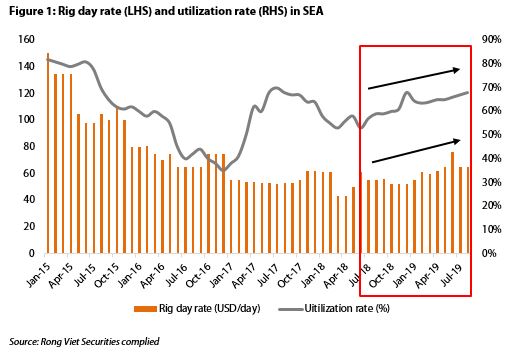 Due to the recent downtrend of oil price, E&P activities have slowed down and have only experienced some improvement since 2018. However, the demand for jack-up rig has recovered, thanks to the slight increase in two main indicators: rig day rate and utilization rate.