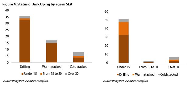 Typically, drilling rigs are classified into three main categories: under 15 years old, 15-30 years old and over 30 years old. Young rigs, which are under 15 years old, account for 85% of the total (excluding the under-construction rigs) in Southeast Asia, resulting in fierce competition in the region. Data shows that 33 out of 36 contracted rigs are young. So the 13 rigs being built in Singapore can be seen as potential competition for existing rigs in the region.