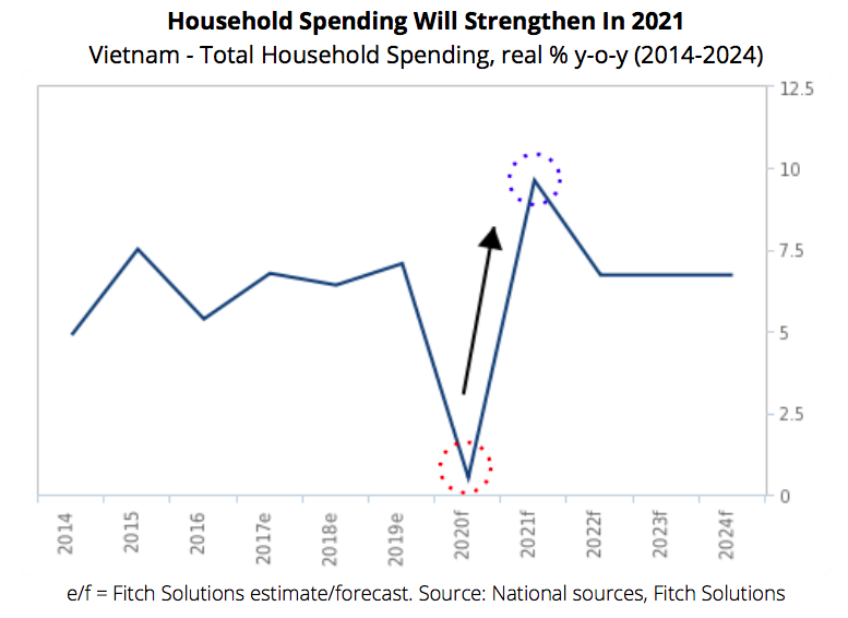 Vietnam’s household spending is projected to grow by a real rate of 9.6% year-on-year over 2021, a significant improvement from a projected 0.5% growth in 2020, according to Fitch Solutions, a subsidiary of Fitch Group.