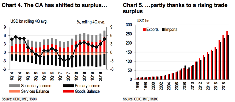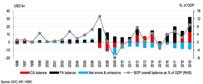 Looking at the breakdown, the driver for the BOP surplus has somewhat shifted. Prior to 2011, a large financial account (FA) surplus was the main contributor, even during the global financial crisis (GFC) when the BOP turned into deficit for two years. However, after 2011, the current account (CA) turned from deficit to surplus (except in 2015 and 2017), pushing the BOP into a large surplus.