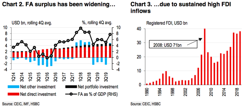 Vietnam’s accession of the WTO in 2007 opened the door for its large FA surplus. It has introduced a sustained influx of sizeable foreign direct investment (FDI). In particular, registered FDI jumped to US$71 billion in 2008, a three-fold increase from the preceding year. However, it failed to translate into strong growth, though the timing of the GFC was to be partly blamed. After a few years of falling FDI, Vietnam saw a resurgent in FDI since 2013 with investment from South Korea, in particular from Samsung, flocking into the country.